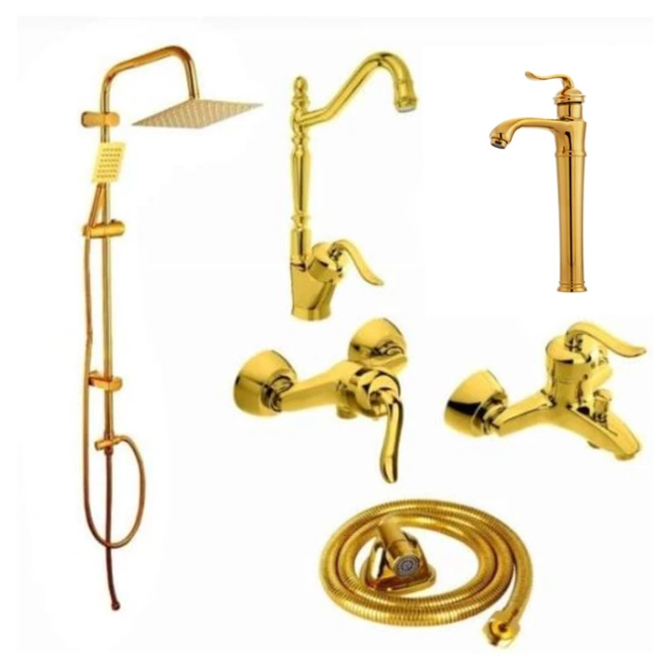 ست 6 تایی شیرآلات قاجاری طلایی با روشویی پایه بلند و علم دوش دوکاره و شیلنگ توالت (پس کرایه)