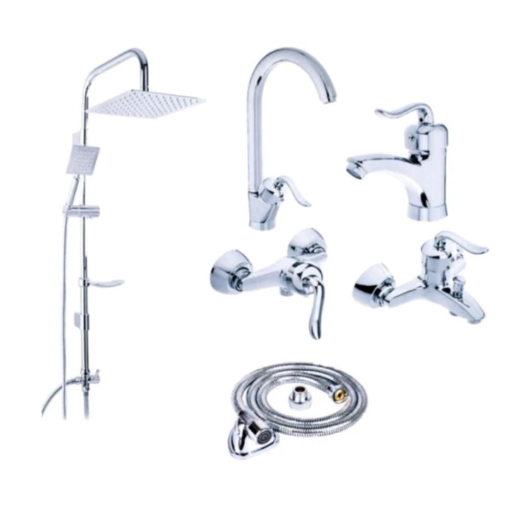 شامل : ۱عدد شیر روشویی-۱عدد شیر آفتابه- ۱عدد شیر دوش - ۱عدد شیر ظرفشویی- ۱عدد علم دوش دوکاره - ۱عدد شیلنگ توالت