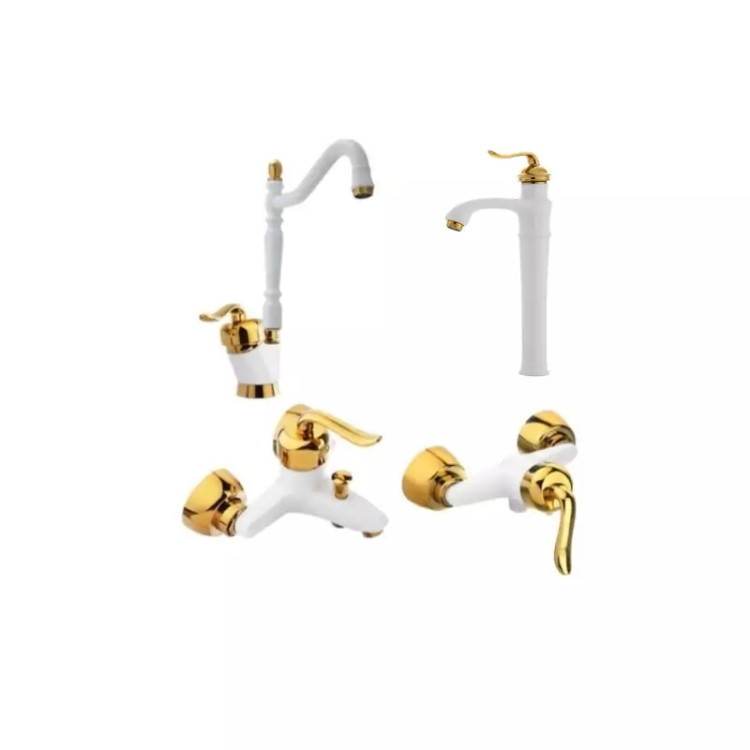 ست 4 تیکه شیرآلات قاجاری سفید طلایی با شیر روشویی پایه بلند(پس کرایه)