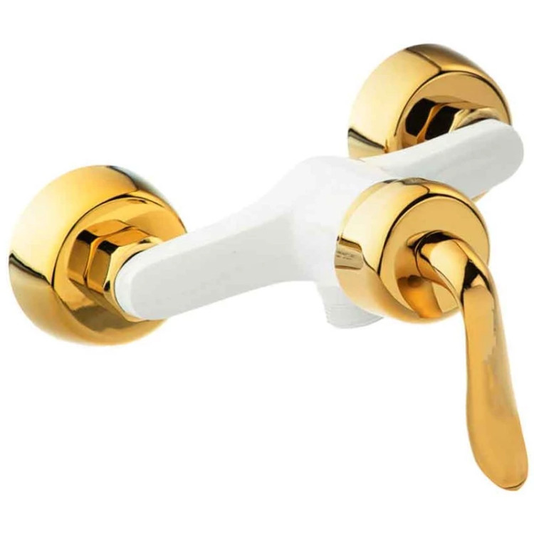ست ۱۰ تایی شیرآلات قاجاری سفید طلایی با علم دوش دوکاره مربع طلایی و شیلنگ توالت سفید طلایی