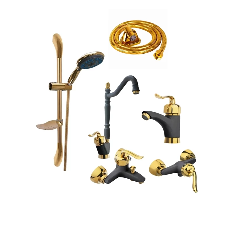 ست 6 تایی شیرآلات قاجاری مشکی طلایی با علم دوش تک کاره و شیلنگ توالت(پس کرایه)