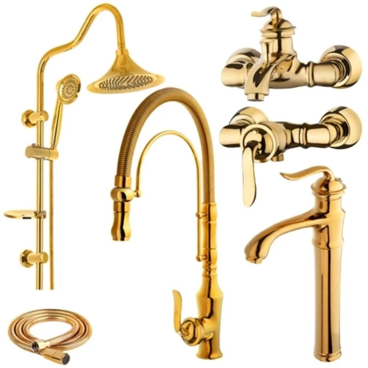 ست 6 تایی شیرآلات هلن طلایی با شیر ظرفشویی فنری و شیر روشویی پایه بلند و علم دوش شیپوری طلایی و شیلنگ توالت (پس کرایه)