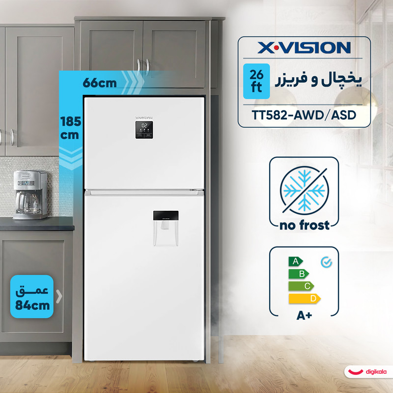 یخچال فریزر 26 فوت ایکس ویژن مدل TT582-AWD/AS ، دارای آبسردکن و یخساز نیمه‌ اتوماتیک، با ارتفاع 185، پهنای 66 و عمق 84 سانتی‌ متر، میزان مصرف انرژی A+، دارای 4 طبقه در یخچال و 2 طبقه در فریزر
