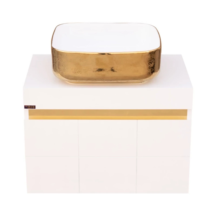 ست کابينت و روشويي سیتکا مدل WR-cot009 روکار به رنگ سفید طلا می باشد که توسط برند سيتکا با سالها تجربه در ساخت سینک و کابينت روشويي هاي لوکس و استاندارد توليد شده است .اين محصول از دو قسمت ساخته شده است .قسمت کابينت کلیه اجزا آن از جنس pvc شانزده میل بوده و قسمت روشويي آن از جنس چینی کوتینگ شده خارجی مي باشد.اين نوع از روشوييها در دسته کالاهاي لوکس ساختماني قرار ميگيرند .مشخصههاي بارز اين محصولات ضدآب و ضد رطوبت بودن و تنوع رنگي بسيار بالاي آن هاست. يراق آلات اين محصول استيل بوده و در محيط مرطوب زنگ نمي زند. کاسه روشويي cot یک ;کاسه روکار می باشد .در حال حاضر پرفروش ترين کاسه روشويي هايي که مورد استقبال مردم واقع مي شوند، مدل هاي روشويي روکار و یک تیکه مي باشند.لازم به ذکر است شيرالات قابل نصب براي اين محصول شير روشويي بایه بلند و شیر الات توکار دیواری میباشد.