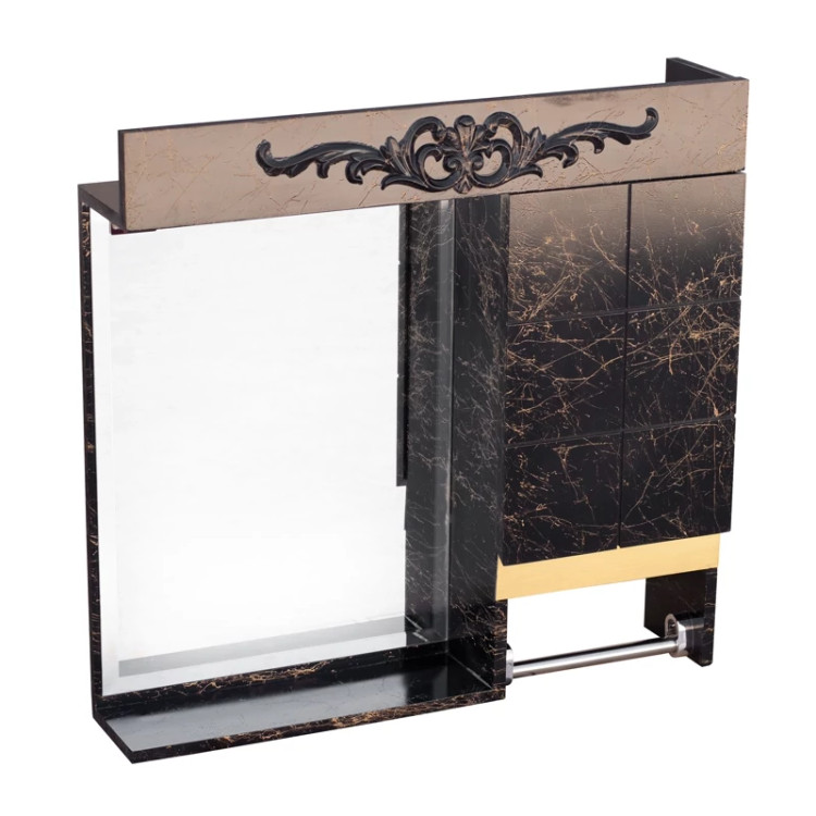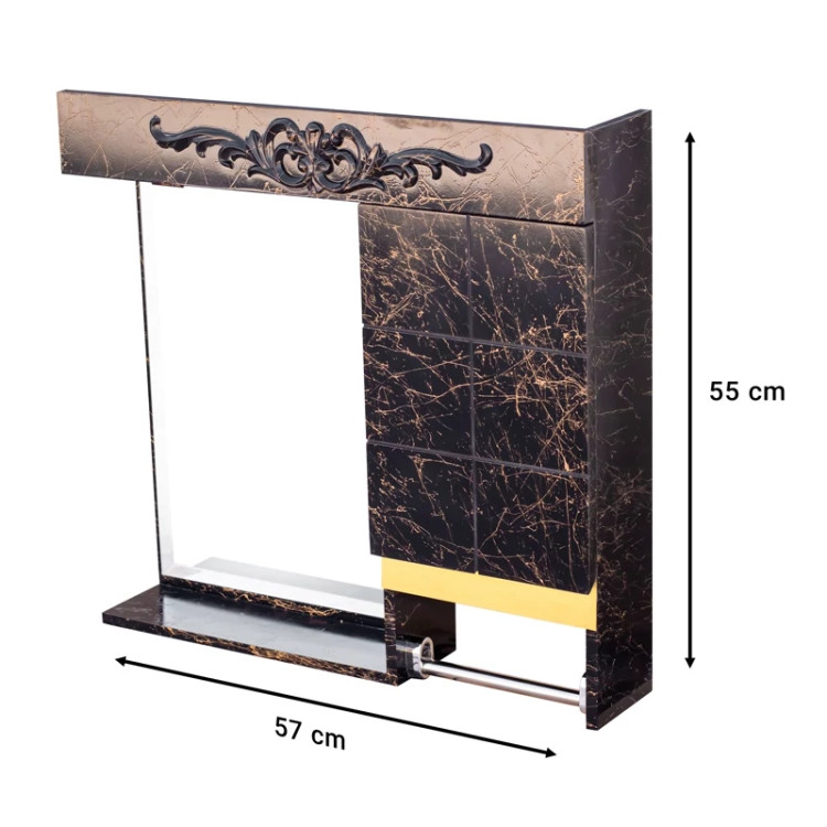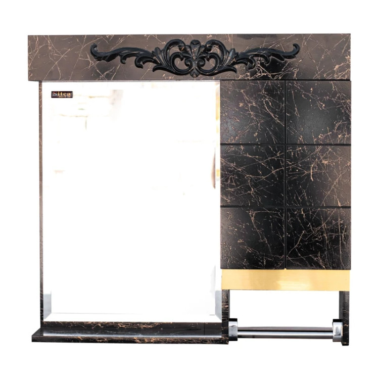 ست آینه و باکس سیتکا مدل BR از PVC مرغوب به رنگ مشکی با رگه های طلایی ساخته شده است این گونه اینه ها به دلیل ضد آب بودن pvc و سازگاری این جنس با رطوبت و آب در حمام و سرویس بهداشتی مورد استفاده قرار میگیرن . اگر قصد خرید کابینت روشویی و آینه باکس از جنس پیویسی دارید، به ضخامت ورق توجه کنید .ست آینه باکس سیتکا با بدنه پی وی سی 12 میلیمتر و درب 16 میلیمتر ساخته شده است که با رنگ 21 ماشین براق پوشش داده شده که همگی کاملا ضد آب می باشند و به مرور زمان تغییر رنگ نمیدهند. آینهی بهکار رفته از نوع درجه یک سوپر کریستال بشت جیوه نقره بوده و در مجاورت آب و بخار به مرور زمان دچار زنگ زدگی نخواهد شد. در این محصول از لولا های تمام استیل از نوع آرام بند به کار رفته است . همچنین آینه این مدل از تراش 1 سانتی متری نیز بهره می برد که باعث زیبایی و استحکام بیشتر محصول می شود.