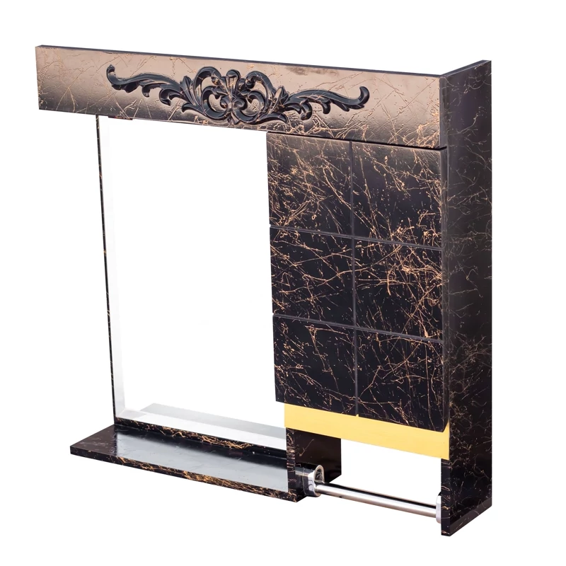 ست آینه و باکس سیتکا مدل BR از PVC مرغوب به رنگ مشکی با رگه های طلایی ساخته شده است این گونه اینه ها به دلیل ضد آب بودن pvc و سازگاری این جنس با رطوبت و آب در حمام و سرویس بهداشتی مورد استفاده قرار میگیرن . اگر قصد خرید کابینت روشویی و آینه باکس از جنس پیویسی دارید، به ضخامت ورق توجه کنید .ست آینه باکس سیتکا با بدنه پی وی سی 12 میلیمتر و درب 16 میلیمتر ساخته شده است که با رنگ 21 ماشین براق پوشش داده شده که همگی کاملا ضد آب می باشند و به مرور زمان تغییر رنگ نمیدهند. آینهی بهکار رفته از نوع درجه یک سوپر کریستال بشت جیوه نقره بوده و در مجاورت آب و بخار به مرور زمان دچار زنگ زدگی نخواهد شد. در این محصول از لولا های تمام استیل از نوع آرام بند به کار رفته است . همچنین آینه این مدل از تراش 1 سانتی متری نیز بهره می برد که باعث زیبایی و استحکام بیشتر محصول می شود.
